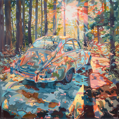a James Jean inspired painting of a 2023 car in the woods with the sun shining