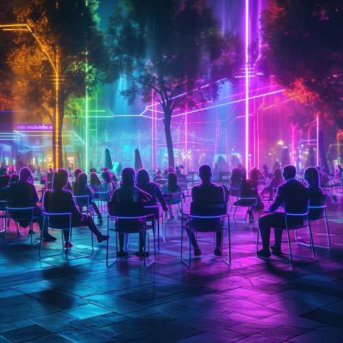 graduation plaza lots of people sitting in chairs futuristic 4D HD outdoor park neon lights hyper realistic --v 6.0