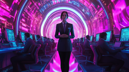 The image portrays a futuristic office or command center, with a woman standing confidently at the forefront. She wears professional attire, including a blazer and a pencil skirt, with her hands clasped in front of her. Behind her, rows of workers are seated at desks, each with a computer screen, giving the scene a structured, high-tech workspace vibe. The environment is illuminated by neon lights in shades of purple, pink, and blue, with curved lines and digital elements forming an arched, tunnel-like backdrop that converges behind the woman. The setting is reminiscent of a technologically advanced, cyberpunk-inspired control center or operations hub, suggesting themes of leadership, teamwork, and digital innovation. The woman is not hyper-realistic but looks more like a high quality vector illustration --ar 16:9 --v 6.1