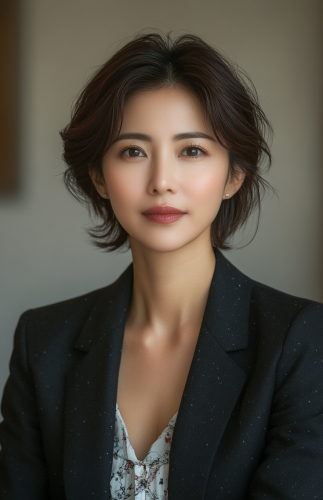 A Chinese woman in her forties, sitting in a chair with short hair, wearing a black suit jacket and a white floral dress. In a high-resolution white background, there are a few wrinkles on the face facing the camera. This is a professional photo. --ar 67:104 --style raw --stylize 750 --v 6.1