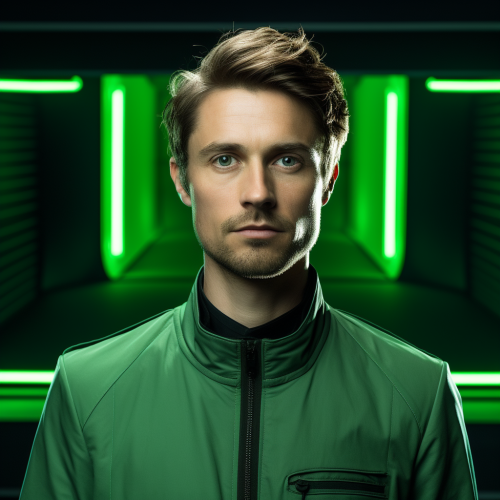 A man stands in front of a mirror, smiling in disbelief as he touches his newly grown, healthy hair. His expression is a mix of excitement and happiness. The scene is modern, with a minimalistic bathroom background, softly lit. Blue and yellow light subtly reflect off his hair, highlighting the transformation.