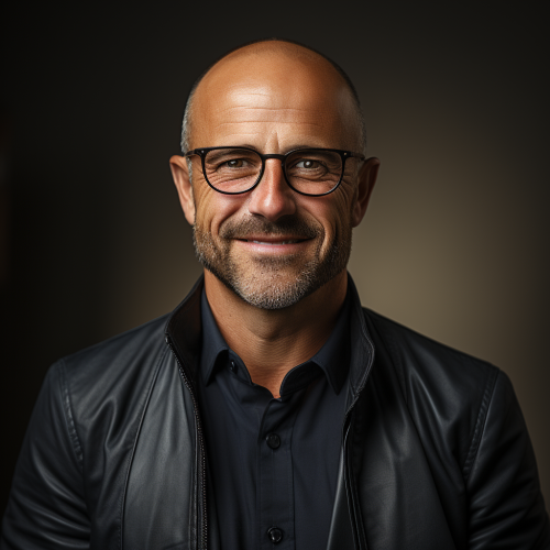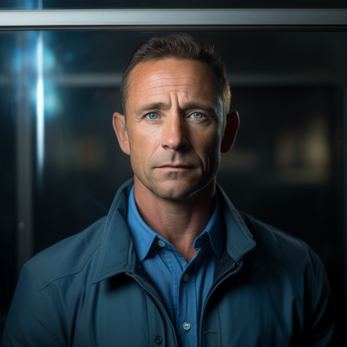 a photo portrait of a 45 year old business man wearing casual clothes - the image is framed in a crystal pane of glass. The backgound is a deep blue color, shallow DOF