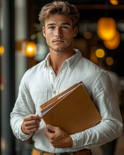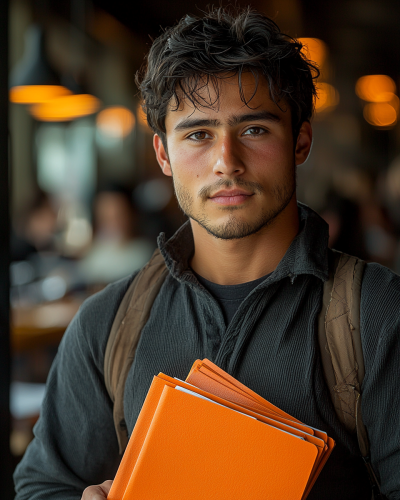 General view of a 22 year old young man, hispanic, short black hair, dressed in office clothes holding some folders and looking at the camera, with a good attitude, he must be in an office with good light, general view of the office, in the background there are several people in work stations, High-resolution photography --style raw --q 2 --s 750 --ar 4:5