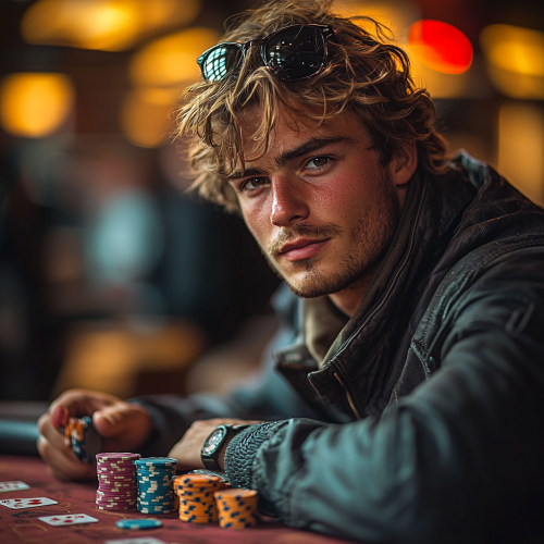 A young man sits confidently at a poker table, his expression impassive and focused. He wears dark sunglasses, adding an air of mystery, and holds his cards with a controlled, steady hand. The photograph captures ample space around him, showing the poker table complete with neatly arranged chips and a few scattered cards, giving depth to the setting. The background is a soft pastel gradient with no harsh shadows, and the lighting is natural, low in contrast to maintain a gentle, realistic feel. This fashion photo is expertly retouched, capturing every detail in the fabric of his high-end clothing and the calm intensity of his posture. --q 2 --s 750