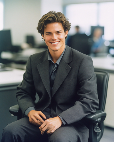a 35-year-old man, brunette, wearing a dark gray suit, sitting on a boss office chair, smiling at the camera, office background, 35mm fuji film --no beard --ar 4:5