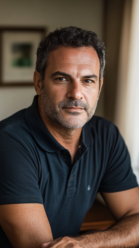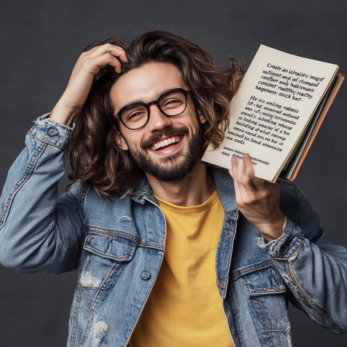 "Create an ultra-realistic image of a confident and charismatic male with a full head of healthy, thick hair. He is smiling, radiating happiness and self-assurance, as if he’s achieved his hair goals. He is holding a mockup of a book in one hand while his other hand runs through his hair, showing off its volume and shine. His face exudes charm and confidence. No text or writing on the image."