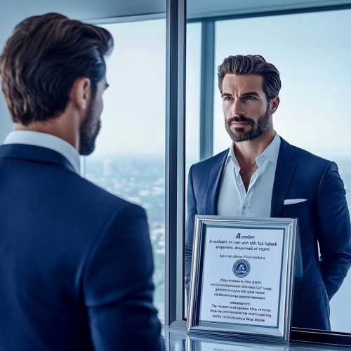 "A confident man with full hair in a sleek, modern office with a large window, allowing natural light to fill the room. On the desk, there’s a certification or seal of approval, representing expert endorsement. The man looks into the mirror, with a blue and white color palette that symbolizes safety and trust. The image suggests an authoritative and trustworthy solution to hair loss, focusing on professionalism and reliability."