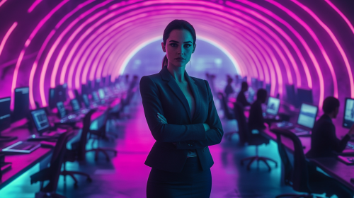 a young man sits at a modern, sleek desk within a high-rise building during the night, engaging in either podcasting, streaming, or recording. He is dressed in a hooded jacket with the hood up and a bandana covering the lower half of his face, and he wears dark sunglasses, adding to his enigmatic appearance. The setting is illuminated by ambient lighting that shifts between blue and red hues, creating a moody and atmospheric cyberpunk vibe. The man is equipped with a professional microphone complete with a pop filter, indicating his activities involve high-quality audio production. In front of him are two monitors: one displays a dynamic, swirling geometric pattern, suggesting motion and digital activity, while the other shows detailed digital data visualization, potentially related to the content he is producing or monitoring. The backdrop features a cityscape visible through the window, showcasing a myriad of lit office buildings, which adds depth and context to the scene by highlighting the urban, high-tech environment he is part of. The overall composition of the image, with its focus on advanced technology and the digital motif, encapsulates a futuristic narrative centered on digital communication and media production. looking straight, full front view, looking forwards, front view --ar 16:9