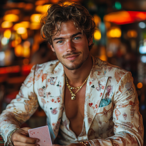 A stylish young man sits confidently at a brightly lit poker table, holding his cards casually in one hand, a relaxed smile suggesting his confidence in the game. He’s dressed in high-fashion attire with modern, luxurious fabrics in light, vibrant colors --no dark, brown, or black tones anywhere in the scene. The table is surrounded by an impressive stack of colorful poker chips, adding to the atmosphere of success and wealth. The background is a soft pastel gradient in fresh, uplifting tones, with natural, diffused lighting that avoids harsh shadows and enhances the lively, upscale feel of the photo. This expertly retouched image captures every detail of his outfit and expression, creating a realistic, polished scene that radiates sophistication and affluence in a bright, light-hearted setting. --q 2 --s 750