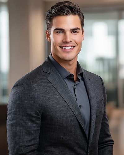 medium establishing shot of a confident young smiling man standing in a fun modern tech office, Daytime lightning, ultra wide-angle lenses, detailed photography, shallow depth of field, directed by the Russo brothers, large format IMAX, Kodak --ar 3:4 --style raw --s 250