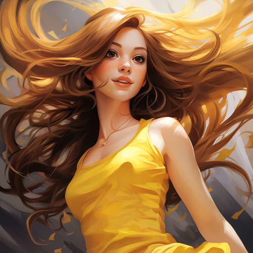 a confident girl, free style, liberal, yellow dress, long hair, cartoon style