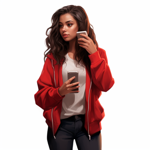 realistic Illustration of a confident spanish girl in a cartoon style. She's dressed in a red weatshirt. Paired with her sweatshirt are black jeans and a long black coat. She has on red, white, and black sneakers on. She's talking on her cellphone.