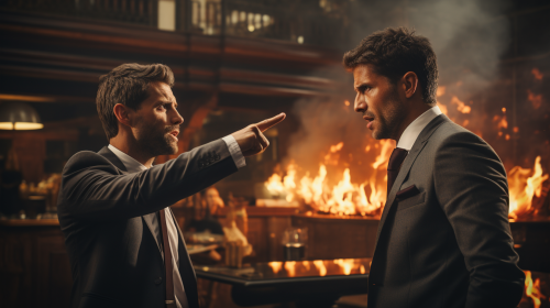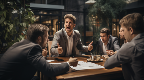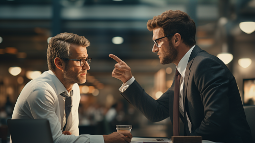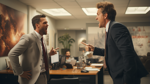 Charistmatic businessman arguer his workmate in office photorealistic --ar 16:9 --s 250