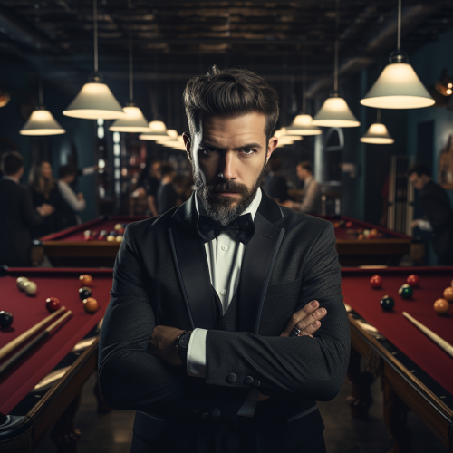 a business man standing holding a billiards cue, between two billiards tables, with shrugging shoulders and an extremely confused look on his face