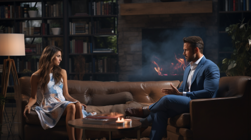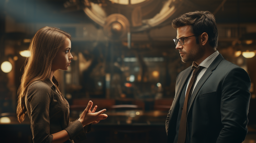 Explaining Businessman argue to his confused girlfriend photorealistic --ar 16:9 --s 250