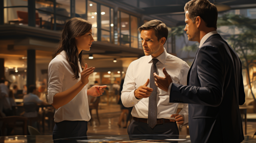 Charistmatic businessman talking to his confused workmate in the office photorealistic --ar 16:9 --s 250