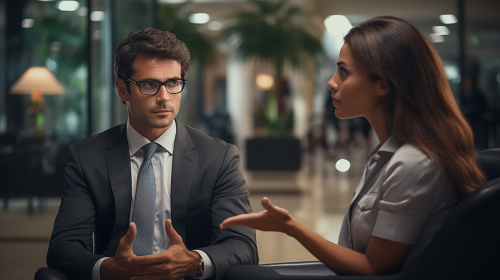 Businessman listening to middle class woman explaining indoor photo-realistic --ar 16:9 --s 250