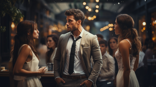 irritable Businessman argue to his confused girlfirend and friends indoor photorealistic --ar 16:9 --s 250