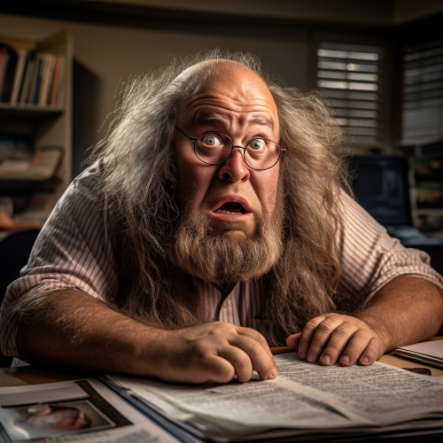 an overweight middle aged balding neanderthal caveman in a collared shirt and glasses, grey hair and beard, sitting at his desk in a school office, scratching his head, very confused and bewildered