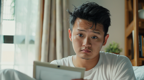 "A young man sitting at a desk, showing clear signs of brain fog. Their expression is dazed and slightly confused, with furrowed brows and half-closed, tired eyes that appear unfocused, staring blankly ahead. They have dark circles under their eyes, suggesting fatigue or lack of sleep. One hand is placed on their forehead, as if trying to concentrate or remember something, while the other hand rests on an open book or laptop keyboard. Their posture is slouched, shoulders slightly hunched forward, indicating low energy or mental exhaustion. The background is softly blurred, emphasizing a sense of mental haze and difficulty concentrating. A dimly lit room with scattered papers, a cup of cold coffee, and a clock showing late hours adds to the feeling of mental fogginess and struggle.