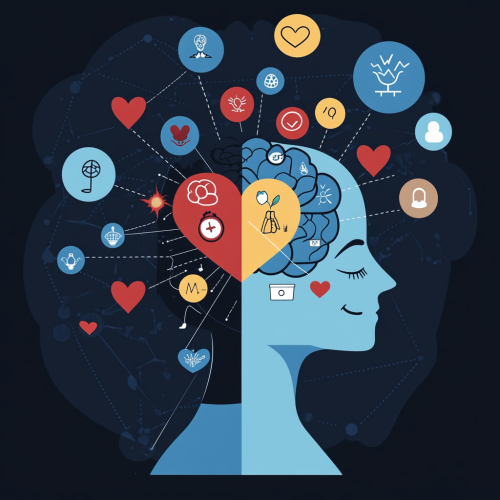 a figure with the heart and brain connected, representing the Emotional Quotient, with icons that symbolize empathy, such as hearts or facial expressions of positive emotions, and social interaction, such as connecting hands or gestures of collaboration.