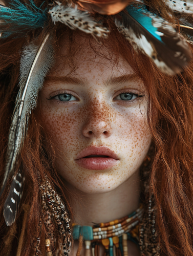photography portrait of tracker/fantasy tribal freckled girl , white background, feathers and beads in hair. Shoulders and up, show all of her hairs, --v 6.1 --ar 3:4