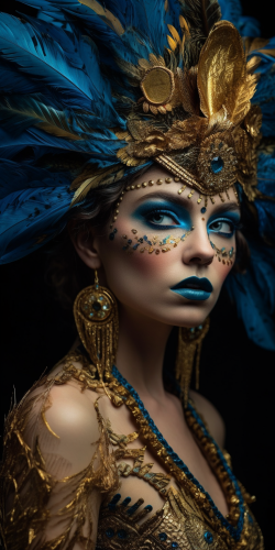 Woman dressed in a blue and gold costume, with a blue feathered hat and a feathered headdress. She is the focal point of the image and occupies most of the space. The woman's face is adorned with gold leaves, adding to the elaborate nature of her costume. Close-up shots of her lips and nose highlight the attention to detail in her makeup and accessories. A gold compass is also featured in a close-up shot, possibly serving as a prop or a symbolic element within the image. Additionally, a gold piece of armor is displayed on a blue cloth, suggesting a connection to a historical or fantasy theme. --v 5.0 --ar 1:2 --s 500