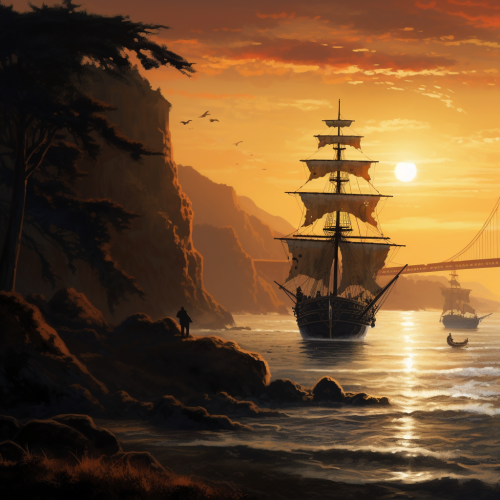 a movie poster of the Golden Gate bridge at sunset with a haunting looking pirate ship arriving to shore in the style of an old goonies movie from the 1980s in 35mm film