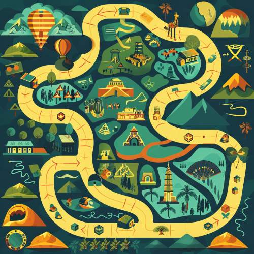 a board game that includes different sections of land which represent different countries with artifacts. Should have more than 15 paths that intercept those sections of land. Made in a retro midcentury style, flat graphic style, fun and playful elements, and bright colors in a simple composition.