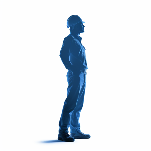 :blue silhouette of a construcion man with arm on the side, white background --v 5.0