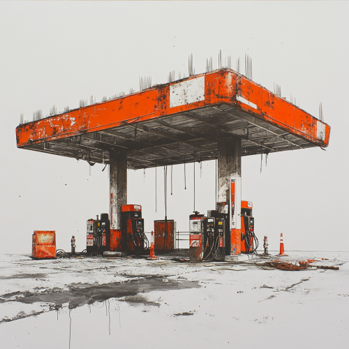 An unfinished gas station set against a white background, with bold, orange accents standing out vividly. The incomplete metal framework of the canopy shows touches of bright orange, drawing the eye to the structure's suspended state. Scattered construction materials--pipes, barriers, and tools--feature hints of orange, contrasting sharply with the stark white backdrop. The station appears paused mid-construction, with the color orange bringing a sense of energy to an otherwise still and quiet scene. --s 250