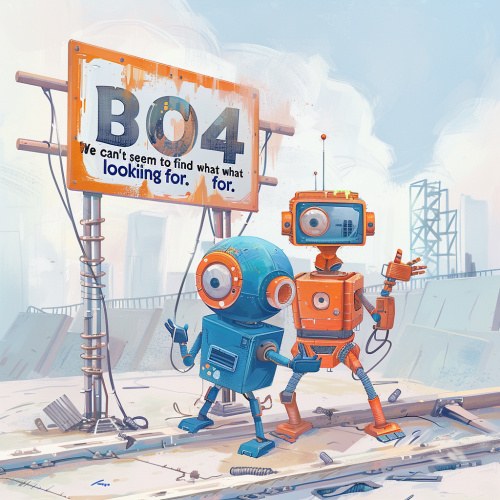 a couple of cute funny construction robots on a construction site that are looking for something that is missing. colors are blue and orange on a white background. There should be a very large sign that reads "404 We can't seem to find what you are looking for."