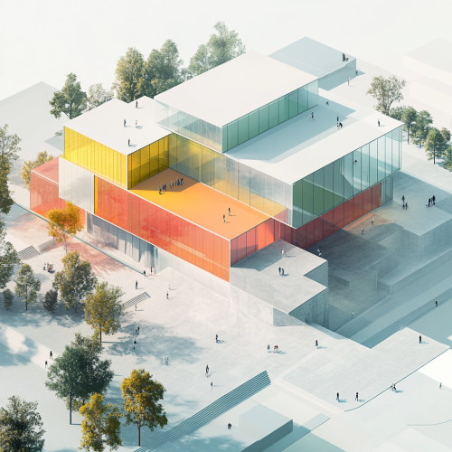 Generate a vibrant, hyper-realistic axonometric view of a contemporary museum in Berlin. The building should be massive yet convey a sense of lightness through its volumes, with large, bold forms contrasted by airy, open spaces. The design should be monumental but calm, with a simple, geometric layout that reveals underlying complexity. Use a rich palette of colors to highlight different materials--concrete, glass, and steel--bringing out their textures in vivid detail. The glass sections should reflect the sky and surrounding environment, adding depth and realism to the scene. The lighting should be natural and dynamic, casting soft, realistic shadows that emphasize the building's form and volume. Surrounding elements should be minimal yet include hints of greenery or urban context to add life to the scene while keeping the museum as the focal point. The image should have the clarity and detail of a high-resolution photograph, with sharp edges, realistic reflections, and a sense of scale that makes the building feel both imposing and approachable.
