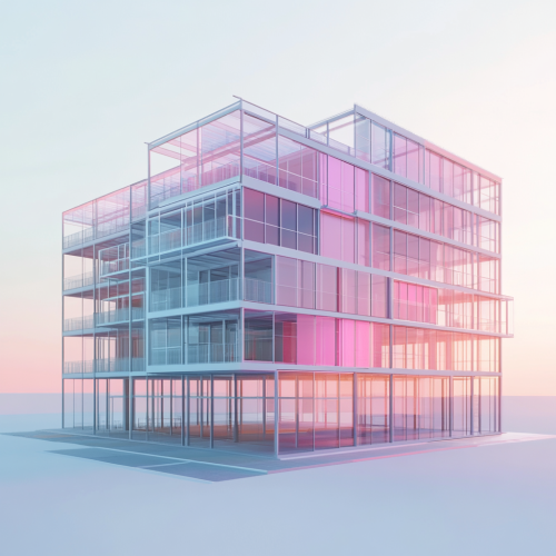 Create a hyper-realistic, delicate 3D render of a modern hotel under construction. The hotel features a rectangular structure with a mix of soft pastel colors, primarily pink and blue tones. It has multiple stories with large glass windows and flat facades. Include fine details such as realistic shadows, smooth textures, and lighting that enhances the structural outline. The building should have clear, crisp edges, with realistic materials and textures, matching the exact proportions and layout of the hotel in the image. The surroundings should reflect an urban setting with smooth pathways and minimalist landscaping. The entire scene should have a futuristic, modern aesthetic with soft reflections on the glass windows and clean architectural lines. v6.1