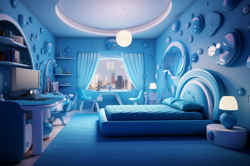 Design an ultra-luxurious master bedroom that echoes the sleek, modern aesthetics of the mansion’s desert facade. The bedroom is expansive, with an open layout that blends seamlessly into the desert landscape. The floor-to-ceiling glass walls offer unobstructed views of the vast desert horizon, allowing natural light to flood the room during the day while offering a panoramic view of the stars at night. To maintain privacy, automated sheer curtains are integrated into the design, with the option to switch between full blackout or transparent modes. The bed is a grand, low-profile platform design with a rich leather or suede headboard in deep, neutral tones that complement the exterior stone colors of the house. Soft organic fabrics in sandy and earthy tones are used for the bedding, enhancing the connection to the desert. Behind the bed, a large accent wall made of textured desert stone mirrors the raw beauty of the landscape outside, while subtle warm LED lighting embedded in the wall casts a soft, ambient glow in the evenings. The floor is sleek and minimal, crafted from polished stone or marble in a light, sandy tone, mirroring the exterior materials. A plush, oversized area rug made from natural fibers in beige or ivory tones adds warmth and comfort underfoot. The ceiling features recessed lighting and a large statement chandelier, perhaps made from brushed metal or a modern geometric design, suspended above the bed. To one side of the room, a cozy seating area is positioned by the glass wall, featuring a pair of contemporary armchairs in a soft neutral fabric, along with a sleek glass coffee table. This area is perfect for morning coffee while enjoying the sunrise over the desert or for winding down in the evening. A sleek, built-in fireplace with a [...]