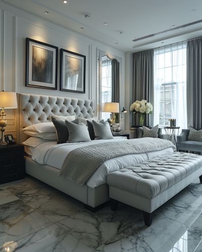 elegant modern bedroom, sleek design, minimalist style, high-end appliances::2 soft natural lighting, wide shot, stainless steel and white marble::1 --ar 4:5 --s 250 --v 6.0