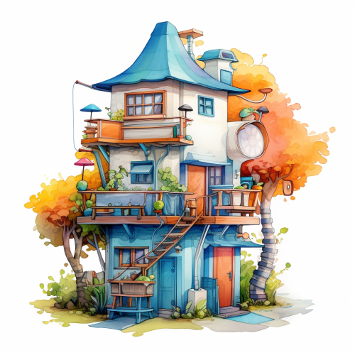 A detached house, realistic, gable roof, in the style of contemporary children's book illustration with bright colors and flowing lines, white background