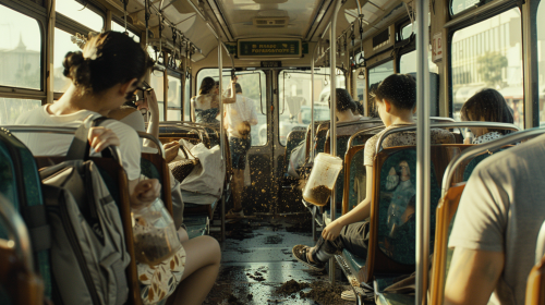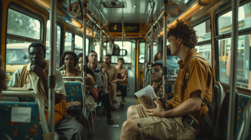 film still, interior of an Australian public transport bus with diverse people, each person is holding a container of dirt, contemporary --ar 16:9