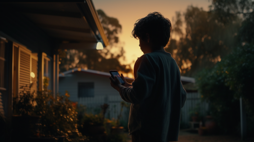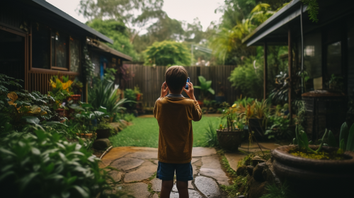 cinematic shot of a child holding a phone horizontally, and filming someone, he is standing in an australian suburban house or garden. --ar 16:9
