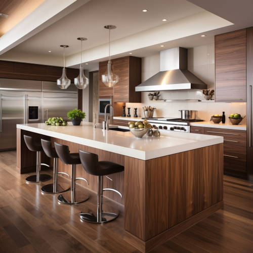 a contemporary style kitchen with a soft, neutral color palette. Cabinets are walnut wood