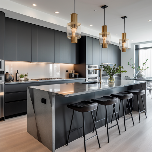 Luxury, new construction condo in Washington DC. View of the kitchen. Kitchen features black countertops, matte grey cabinets, a kitchen island matching the color scheme of the rest of the kitchen. The style is modern and the light fixtures are sleek. Brushed nickel hardware.