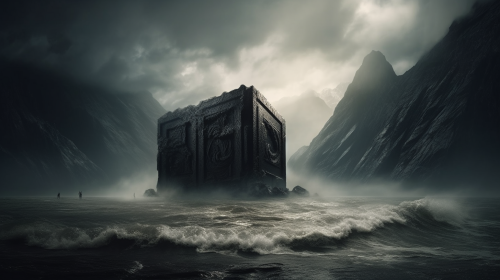 Monolithic massive rectangle emerging from turbulent seas with a mighty cybernetic overshadowing the landscape ancient gigantic ominous zoetrope in mountain hall, fog, anxiety atmosphere, dark and pale shades, aliens monolyths, steam flowing up from hole at center --ar 16:9 --stylize 1000 --v 5.0