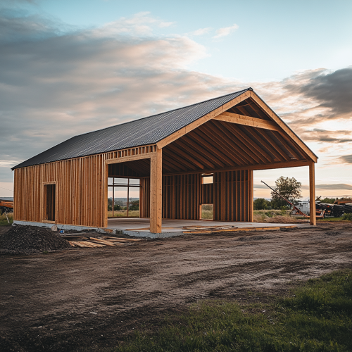 A prefabricated barndominium kit under construction, showcasing pre-cut materials and easy assembly. hyper realism, 4k professional photography --ar 1:1 --v 6.1