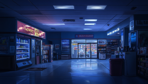 Grimdark science fiction. Interior shot of a 1950's convenient store at night. Closed after hours. Concept art In the style of Steve McNiven. High contrast bright color pallette of cool colors. Gritty action. --ar 7:4 --v 6.1