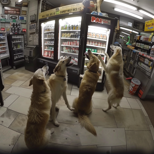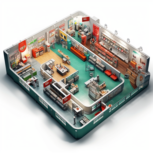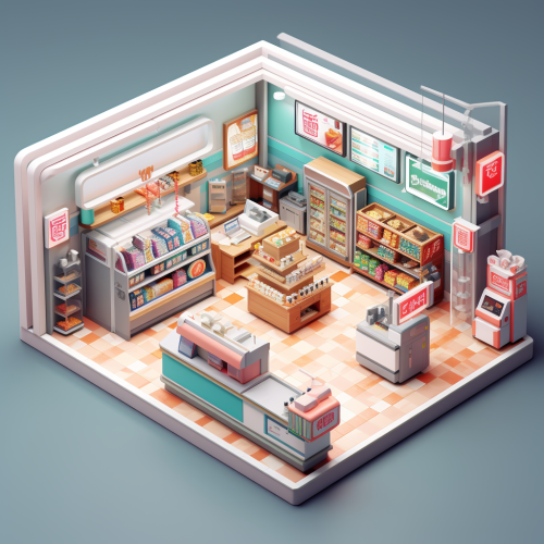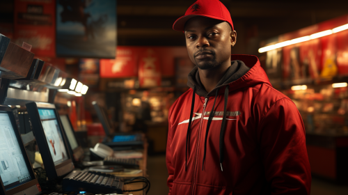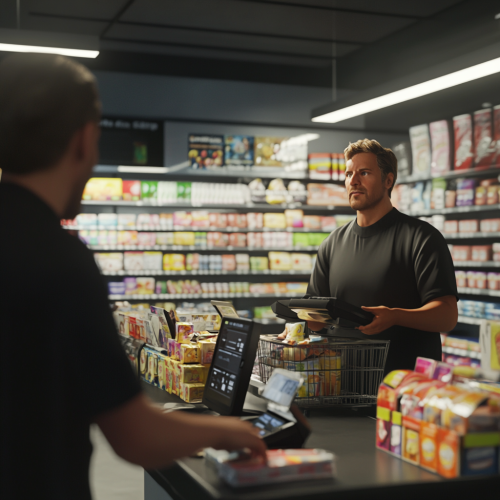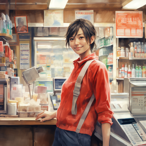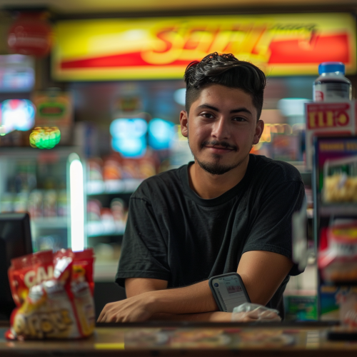 A hyper-realistic depiction of a convenience store cashier