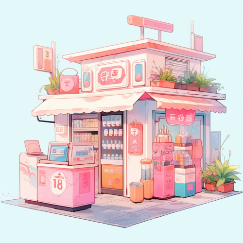 photography realistic front of the convenience store is painted pink, the road running in front, pastel pink tones --s 1000