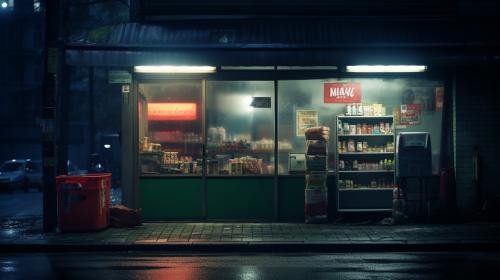 an isolated convenience shop, night, Cinematic film photography, wide angle, dark, moody, blurry photo, imperfections, ethereal, cinestill, --ar 16:9 --style raw