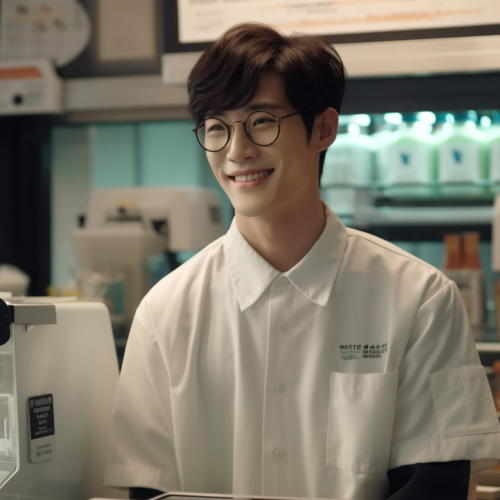 19 year old korean guy working in a convenience store, wearing an apron, uniform, wearing glasses, smiling and laughing, realistic, kdrama scene --v 5.0