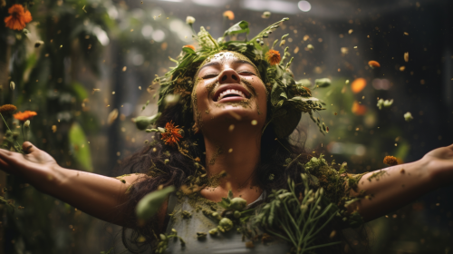 a woman in a plant medicine ceremony looks ecstatic --ar 16:9