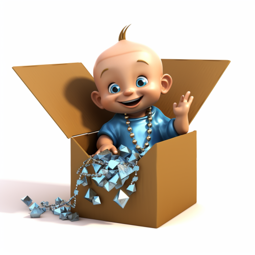 animated 3d baby sitting inside a brown cardboard box package wearing a blue onesie holding jewels and valuables, smiling white background, in the style of Eric Guillon --s 50